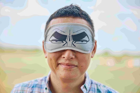 見た目と違い、ふわふわ素材で目元を優しくカバーしてくれる。収納ポーチ付きで持ち運び便利。