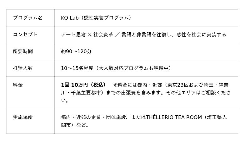 KQ Lab(感性実装プログラム)は、感性を「感情的なもの」ではなく「創造的知性」として捉え直し、感性を社会や組織に実装する新しい学びの形です。