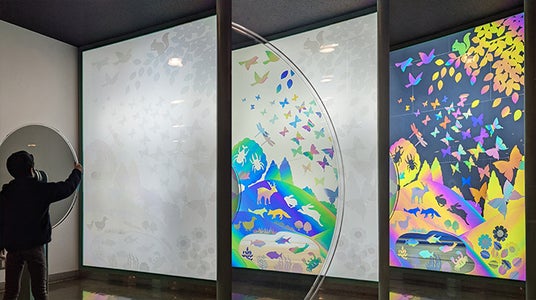 島崎氏の偏光板アートは、現在、東京都北の丸公園内にある日本科学技術館をはじめ、全国の科学館で展示されています。