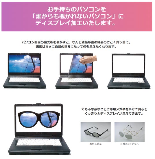 実験的に液晶画面から偏光板を剥がしてみると、画面は真っ白になりました。そこから生まれたのが、覗き見防止PCディスプレイ加工「ミラーレン(R)」です。通常の液晶画面から偏光板を剥がすことで、専用メガネをかけた本人にしか画面が見えない仕組みを実現しました。