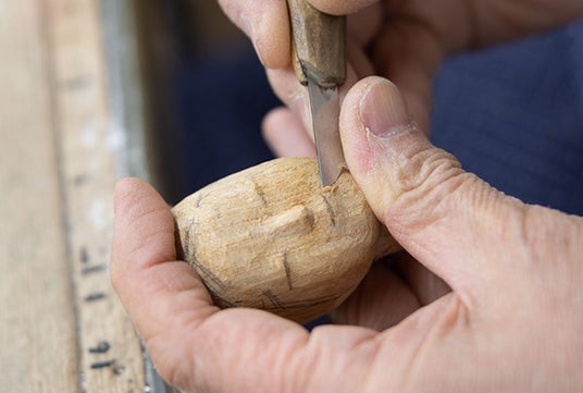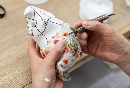 木目込人形は、人形の下地となる胴体を桐塑(とうそ)や木で作り、その表面に溝(木目)を彫ります。この溝に布地を押し込んで(木目込み)人形を形作っていくのが特徴です。職人は専用の道具「木目込べら」を使い、ひとつ一つの溝に丁寧に布を押し込んでいきます。着物の柄や色使いでも、様々な表情を生み出すことができます。