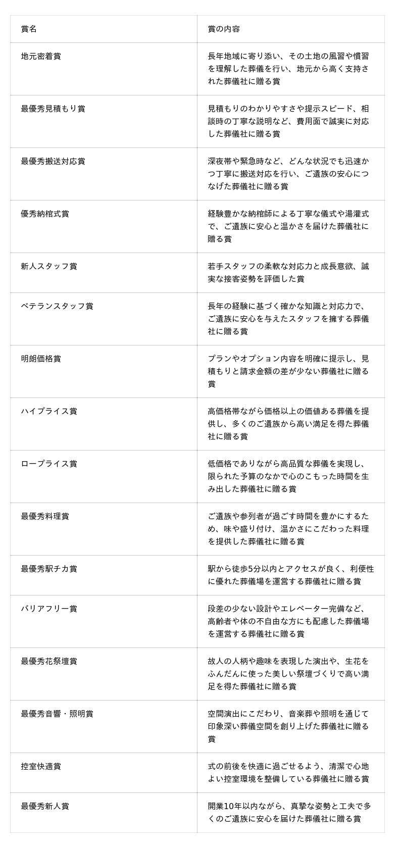 部門賞は、消費者が自分に合った葬儀を実現できるよう、各葬儀社の強みや特徴を評価し、優れた取り組みを選出するものです。