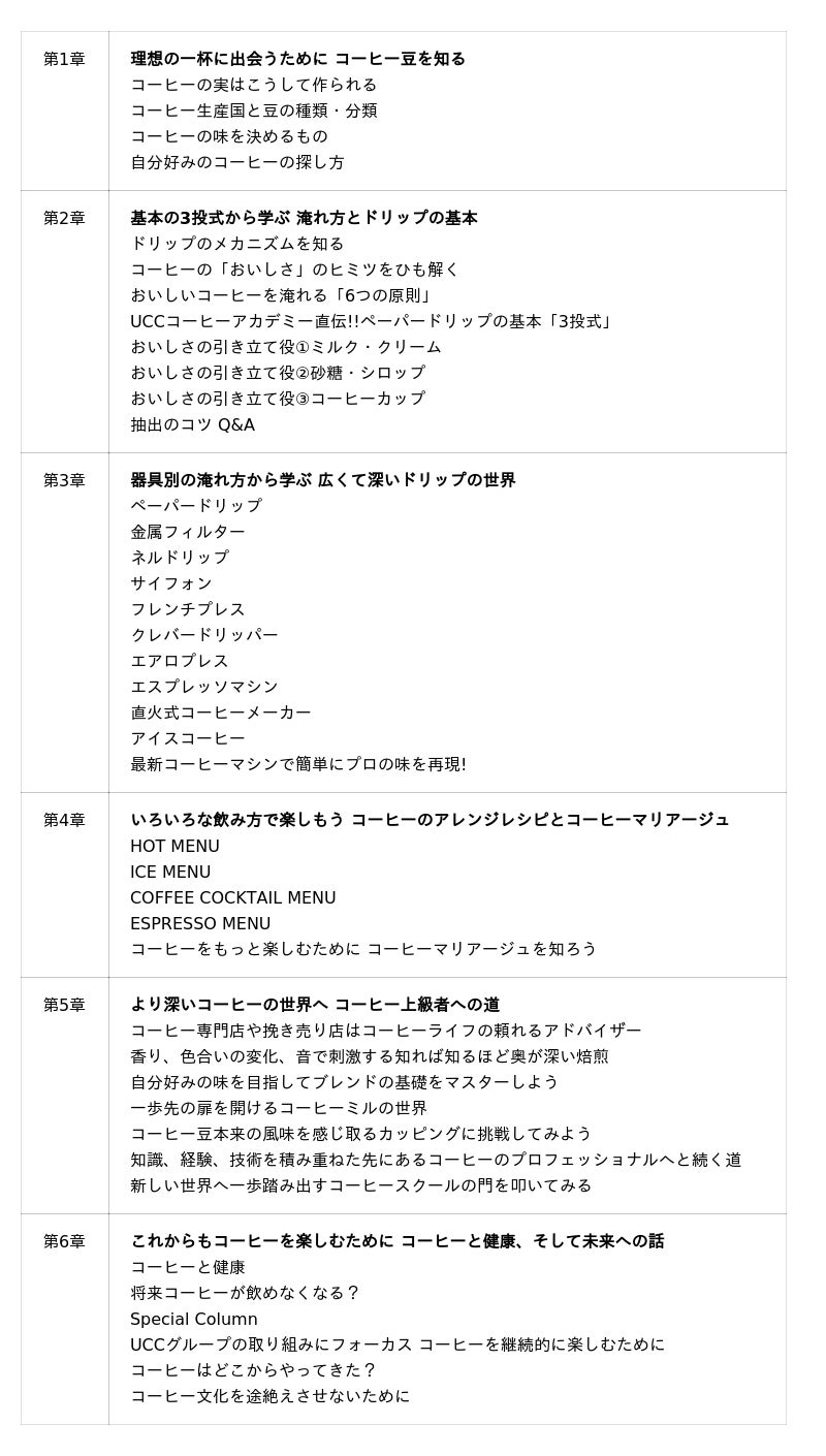 コーヒーの産地、豆の種類、淹れ方、アレンジレシピ、コーヒーマリアージュなど、コーヒーのいろはを「UCCコーヒーアカデミー」の講座内容をベースに写真付きで解説しています。また、コーヒーの研究開発・製品開発を行っている「UCCイノベーションセンター」の知見に基づき、コーヒーと健康の関係や、さらにはこの先の未来も継続してコーヒーを楽しむためのサステナブルな取り組みについても紹介しています。