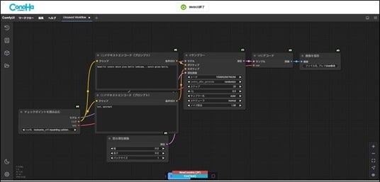 『ComfyUI』は、「Stable Diffusion」を簡単に操作できるビジュアル型のGUI(※4)ツールです。画像生成に必要なそれぞれの機能を「ノード」と呼ばれる1つのブロックとして視覚的に配置し、さまざまなブロックを線でつなぐようなインターフェースを持ちます。これにより、複雑な画像生成のプロセスを視覚的に整理して、直感的に設定、生成を実行できるのが特徴です。通常、『ComfyUI』を利用するためにはGitHub(※5)からお手持ちのPCへダウンロードし、インストール・セットアップの作業が必要となりますが、「ConoHa AI Canvas」ではインストール不要で、Webブラウザ上で手軽に利用することができます。