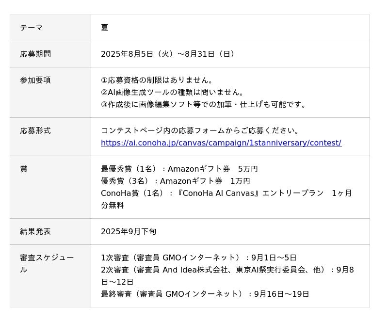 本コンテストの入賞者には、「最優秀賞」「優秀賞」「ConoHa賞」など各種賞をご用意し、受賞作品は特設ページにて発表予定です。また、審査はGMOインターネットおよび外部審査員による複数段階の選考を予定しており、表現力・独創性・話題性など多角的な視点から評価いたします。