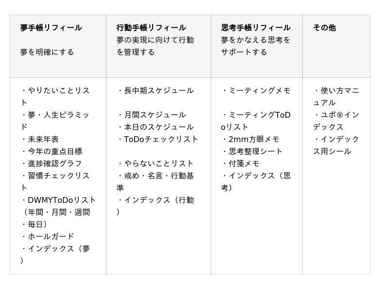 日常のスケジュール管理だけにとどまらず、「夢」「人生」を設計する強力なツールとして手帳をご利用いただけるよう開発されたシステム手帳です。熊谷は、「手帳は仕事や時間を管理するためだけのものでなく、夢や人生をマネジメントするものだ」と考え、手帳に夢を書きこみ、その実現のために思考し行動してきました。