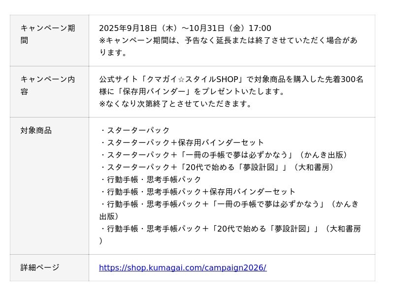 2026年版の販売開始を記念して、2025年9月18日(木)から2025年10月31日(金)17:00までの期間限定で、「クマガイ☆スタイルSHOP」にて対象商品をご購入いただいた先着300名様に「保存用バインダー」をプレゼントする早期購入限定キャンペーンを実施いたします。