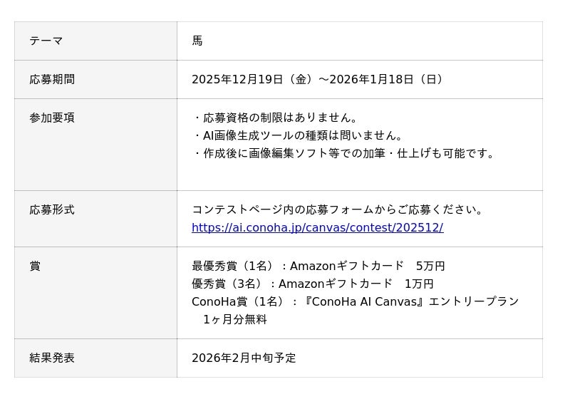 2025年8月に実施した第1回コンテストは、「夏」をテーマに作品を募集し、応募総数300件超と大きな反響をいただきました。そして第2回となる本コンテストは「馬」をテーマに募集いたします。『ConoHa AI Canvas』ユーザーに限らず、画像生成環境をお持ちの方であればどなたでも自由に応募いただけます。生成ツールの指定はなく、画像編集ソフト等での加筆や加工も自由ですので、表現の幅を広げて挑戦していただけます。