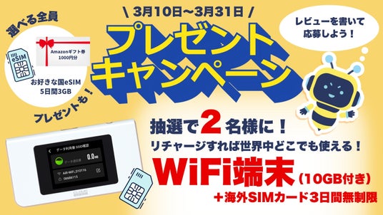 Amazonでのレビュー投稿で、リチャージ可能なポケットWiFiやお好きな国のeSIM、Amazonギフト券をプレゼント!2025年3月10日~3月31日まで応募受付中。