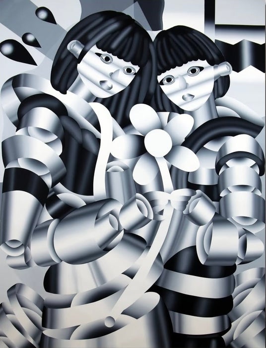 幾何学的な脱構築的な構図で知られる作品は、おなじみのアイコンを再考し、ノスタルジー、消費主義、現代性の交差点を探求している。