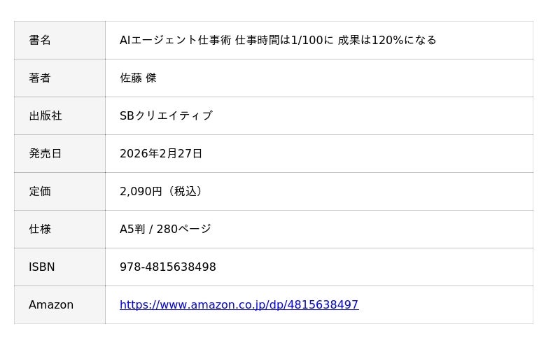 書籍カバー『AIエージェント仕事術 仕事時間は1/100に 成果は120%になる』(SBクリエイティブ、2026年2月27日発売)