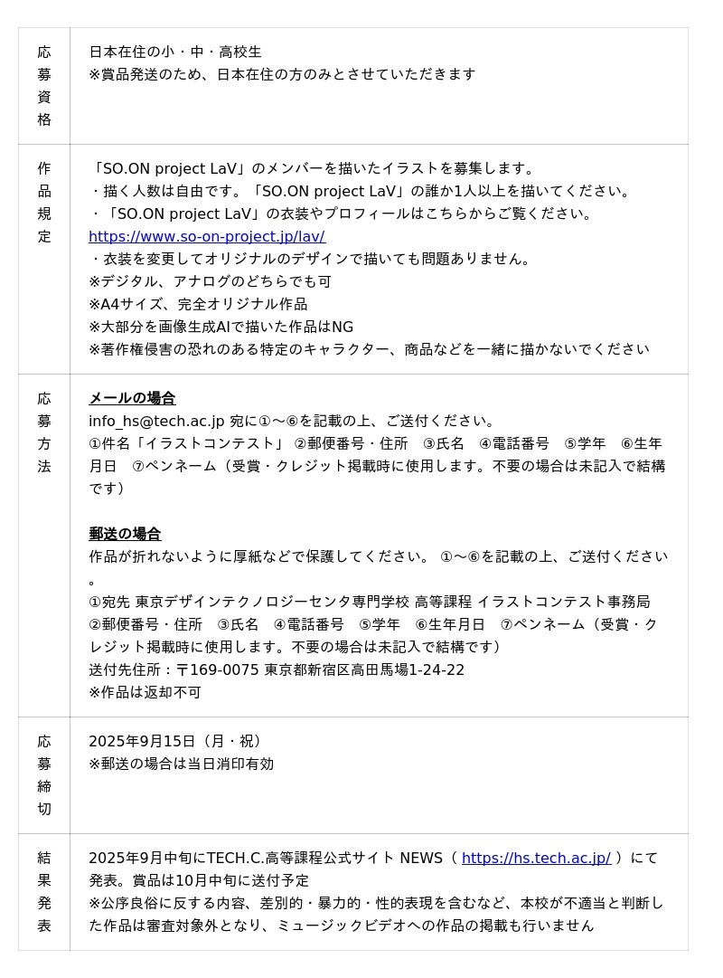 このたびのコンテストは、小・中・高校生のイラストレーターの卵たちの成長を応援したいという思いから開催されるもの。TECH.C.高等課程と滋慶学園グループで運営するバーチャルアイドルグループ「SO.ON project LaV(ソーオン プロジェクト ラブイ)」のメンバーのイラストを募集しています。すべての応募作品は「SO.ON project LaV」のミュージックビデオ「ノスタルジア」に掲載し、動画作品として全世界に発信します。