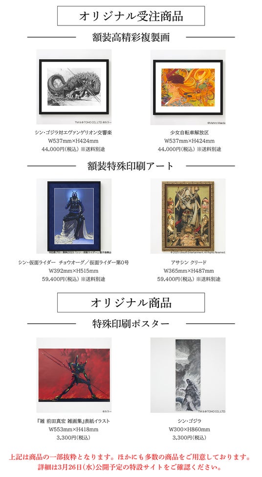 「雑 前田真宏 雑画集」発売記念アート展では、オリジナルグッズの販売を行います。オリジナルグッズは、展示作品でも使用しているDNP高精彩出力技術プリモアートで製作した「高精彩ポストカード」や、箔印刷などを活用した「特殊印刷アート」、また描き下ろし作品による数量限定商品など、多数ご用意しています。全てのグッズのラインナップは、大垣書店ホームページ内の特設サイトにて公開します。(3月26日(水)公開予定)