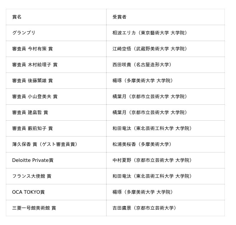 グランプリは相波エリカさん(東京藝術大学 大学院)が受賞し、表彰状の授与と副賞として三菱一号館美術館 Espace 1894での展示の機会に加え、賞金が贈呈されました。