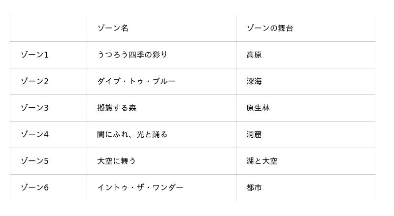 例えば、ゾーン2「ダイブ・トゥ・ブルー」は深海が舞台となり、海面上空からダイブし深海のディープ・ブルーへ潜っていく体験を提供します。また、ゾーン5「大空に舞う」では、空が反射する湖から大空への転換が描かれます。 (2つのゾーンのクリエイティブを横組みする)