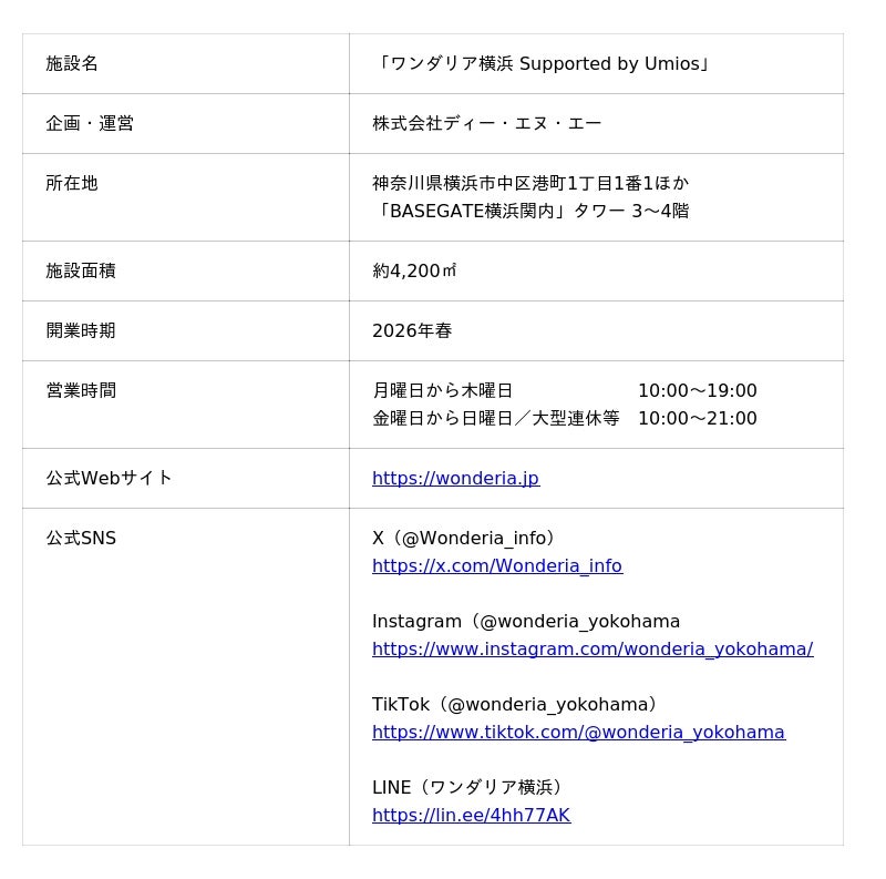 株式会社ディー・エヌ・エー(本社:東京都渋谷区、代表取締役社長兼CEO:岡村信悟、以下 DeNA)は、マルハニチロ株式会社(本社:東京都江東区、代表取締役社長:池見 賢、以下マルハニチロ)と、2026年春に大規模複合施設「BASEGATE横浜関内(ベースゲート横浜関内)」において開業予定の没入型体験施設「ワンダリア横浜」のトップスポンサー契約を締結しました。マルハニチロは2026年3月1日に社名を「Umios株式会社」(以下、Umios)に変更する予定であり、施設の名称は「ワンダリア横浜 Supported by Umios」となります。さらに、施設内の全6ゾーンの名称を公開するとともに、ワンダリア横浜のオリジナルグッズが当たるプレゼントキャンペーンの開催が決定しました。
