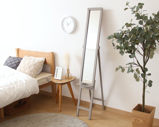 スリム幅で場所をとらないスタンドミラーは新生活におすすめです。他の家具にも合わせやすいマットで優しいペール調のカラーリングが特徴です。ミラー下部には小さな棚がついており、お出かけ前に使う香水やアクセサリーなどを置くことができます。