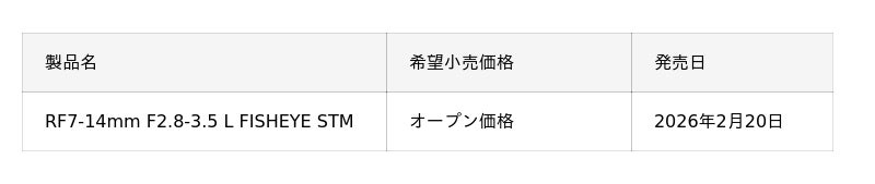 キヤノンは「EOS Rシステム」の交換レンズ「RFレンズ」の新製品として、世界で初めて(※1)全周190°の画角をカバーするフィッシュアイズームレンズ“RF7-14mm F2.8-3.5 L FISHEYE STM”を2026年2月20日に発売します。