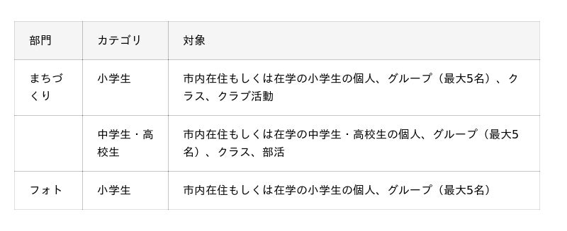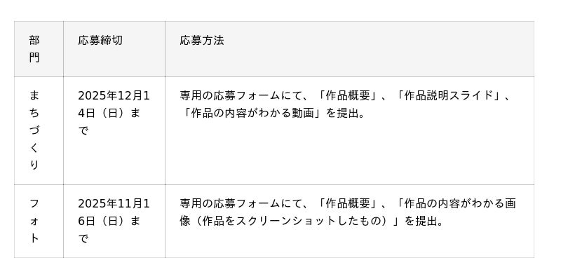 「まちづくり部門」と「フォト部門」の2部門を設けます。