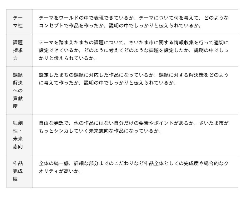 作品募集テーマを踏まえて、さいたま市が目指すべきまちづくりのビジョン(作品コンセプト)を考え、その実現に向けたまちの課題を探求し、その課題の解決につながるまちづくりや、施設の建築をしよう!