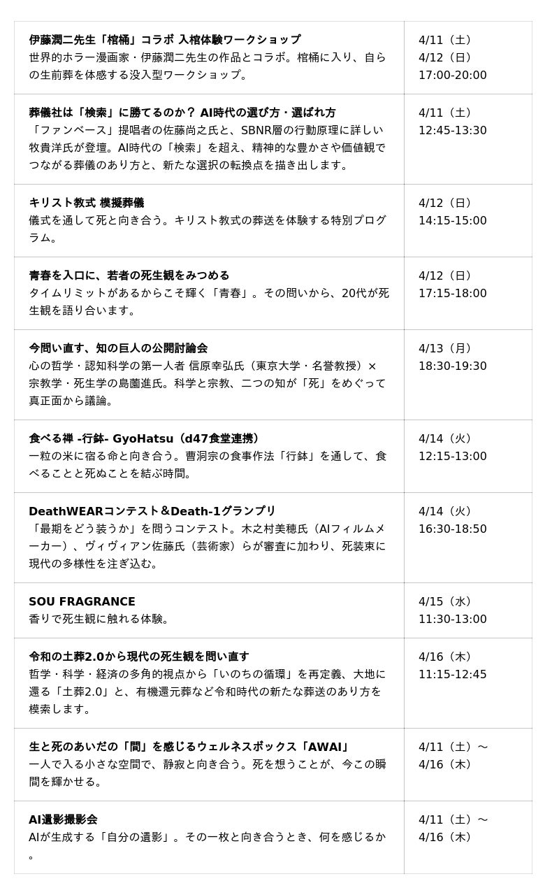 伊藤潤二先生「棺桶」コラボの入棺体験(4/11・12)、香りで死生観に触れるSOU FRAGRANCE(4/15)、生と死のあいだの「間」を感じるウェルネスボックス「AWAI」(期間中)、キリスト教式模擬葬儀(4/12)など、死を身体で感じる体験企画が今年は特に充実しています。