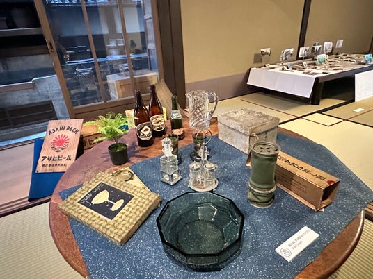 長江家住宅において来客を迎える場であるゲンカンには、メイン展示である谷口藹山「春夏秋冬山水屏風」(六曲一双)を配置し、その前には厄除けの花であり祇園祭では”祭花”として欠かせないヒオウギを飾りました。そして室内へ進むと、昭和時代のガラス食器やビール瓶、ガラス乾板などの日用品に加え、昭和30年代~40年代に長江家の方が収集された広告付きマッチを京都市明細図(※)上へマッピングし、当時の通り景観の古写真も含めた企画展示などを行いました。
