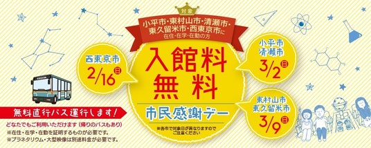 【多摩六都科学館】 運営する5市を対象とした「市民感謝デー」開催(2月16日、3月2日・9日入館無料)