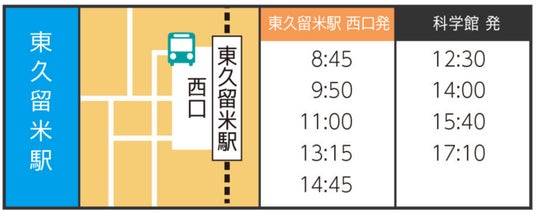 3月9日(日) 東久留米駅 西口 ⇔ 多摩六都科学館 シャトルバス時刻表