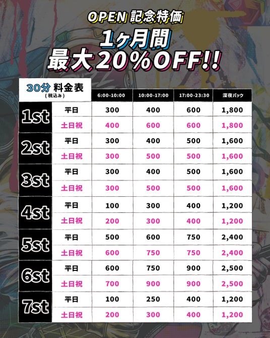 料金:30分100円~(オープン記念特価期間中)