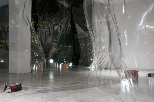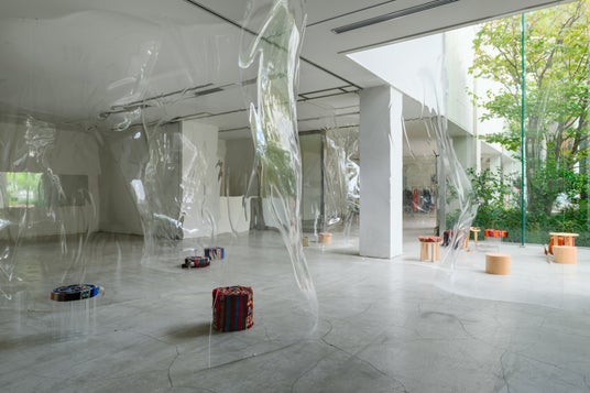 今年のコンセプトは「浮かびあがる空間」。様々な形に曲げられたパーテーションを使って空間全体に透過、ゆがみ、反射を生じさせることで、観る人それぞれに異なるダイナミックな環境空間認識を促します。