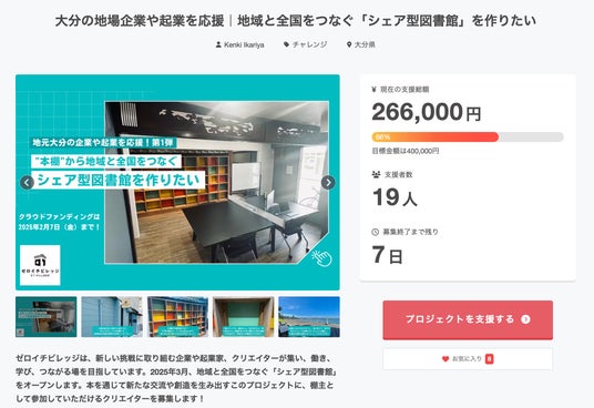 ダイヤモンドツリー株式会社(本社:大分県大分市生石2-4-15、代表取締役:碇谷 堅樹)が運営するシェア図書館併設のコワーキングスペース「ゼロイチビレッジ」は、クラウドファンディング「CAMPFIRE」にて実施中の棚主オーナー先行募集において、開始から1ヶ月で全40棚のうち20%を達成しました。大分県内外のクリエイターや、シェア図書館のコンセプトに共感してくださる皆様から温かいご支援をいただいています。現在の活動状況はCAMPFIREのプロジェクトページにてご確認いただけます。