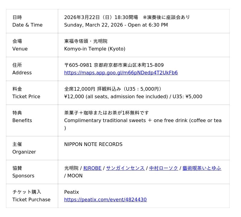 ~2026年3月22日、東福寺塔頭・光明院にて18:30-開門|チケットはPeatixにて発売中~