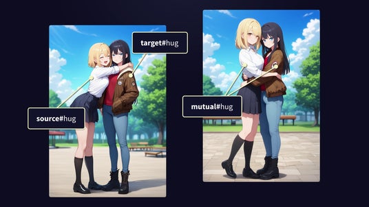 に関してはそれだけではありません。アクションタグによって、キャラクター間のやりとりを新たなレベルで制御できます。どのキャラクターがどのような行動をとり、誰に対して行うのかを指定できるため、場面におけるキャラクター関係を正確にコントロールできます。例えば、「誰が誰を抱きしめているか」「誰が誰に話しかけているか」などの関係性を明確に指定できます。