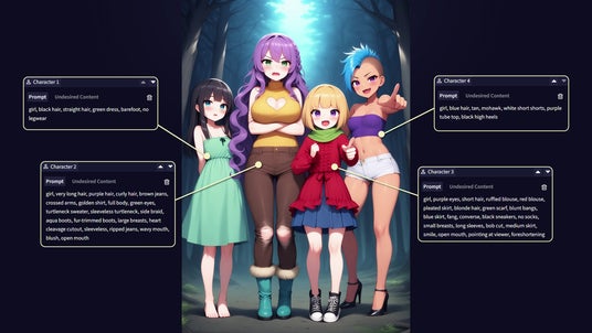 - 各キャラクターのプロンプトを個別に設定できるため、特徴の混在を防ぎキャラクターの一貫性を維持