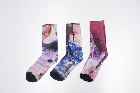 靴下 《網膜/漠悸》、《網膜上の青》、《網膜/十五重塔》*左から順に。作品を大胆にカットアウトした靴下です。