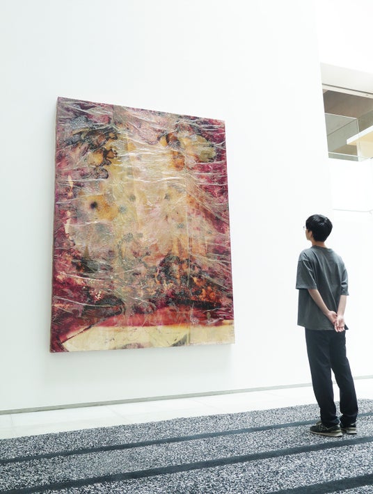 1階エントランス大竹は1988年に東京から宇和島に制作の拠点を移し、時期を同じくして着想されたのが〈網膜〉シリーズです。本展で最初に鑑賞者を出迎えるのは、〈網膜〉シリーズの中でも、最初期であり高さ約3m もある平面作品《網膜火傷》(1990)です。