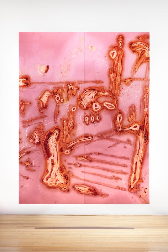 そこから展示室を進むと、1990 年代初頭に制作された未発表の大型作品〈網膜〉や巨大なレリーフ状の最新作《網膜/六郷》(2025)、そして〈網膜〉シリーズから派生し、多様なメディアや形式へと展開した、〈網膜景〉や〈網膜/境〉などの作品が登場します。