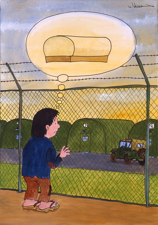 ヒサクニヒコ《占領下の伊勢佐木町[カマボコ兵舎の林立]》1978年 マジック、水彩、アクリル、紙 102.5×72.3cm