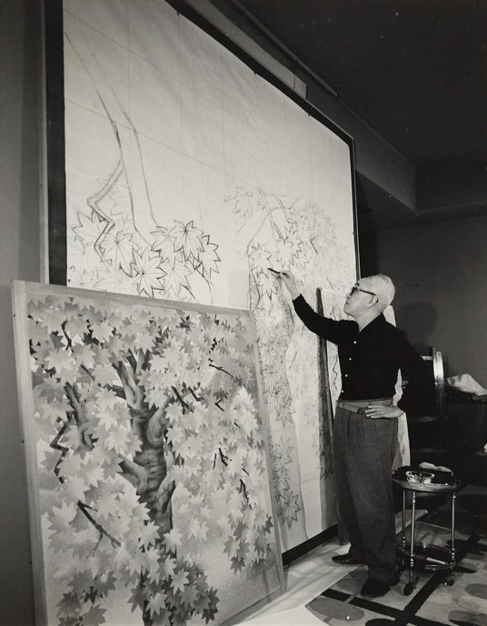 皇宮宮殿に収める杉戸《楓》を制作中の山口蓬春、1967年