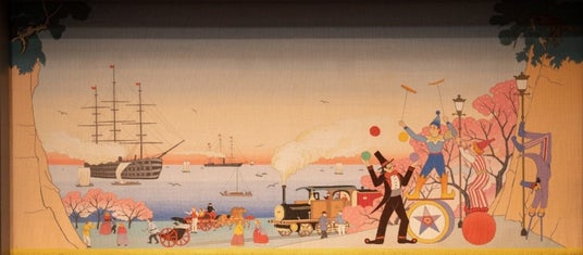 横浜にぎわい座の緞帳は、野毛の切通しから横浜の街を見下ろした風景が描かれています。その中には黒船、大道芸など横浜に関連するものが描かれています。本公演では緞帳に描かれているイラストにちなんだ演目を選びました。