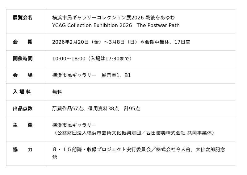 「横浜市民ギャラリーコレクション展2026 戦後をあゆむ」2月20日(金)ー 3月8日(日)に開催