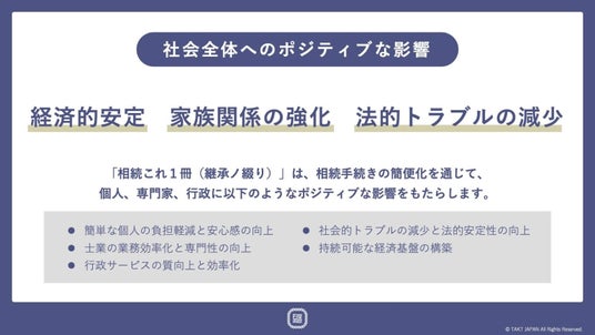 株式会社TAKT-JAPANは、相続これ1冊(継承ノ綴り)の提供を通じて、高齢社会における相続の持続可能な社会の実現を目指しております。