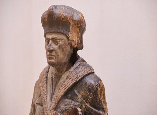 425年前の1600年に大分県臼杵に漂着し日蘭関係を築くきっかけとなったオランダ船「デ・リーフデ号」の船尾に飾られていた「エラスムス立像」(国指定重要文化財 栃木・龍江院所蔵、東京国立博物館寄託)。この重要文化財であるエラスムス立像が大阪城天守閣で初展示されている他、オランダ国立公文書館、国際日本文化研究センター、松浦史料博物館(平戸市)、臼杵市、長崎市から借用した文化財を約30点を展示しています。