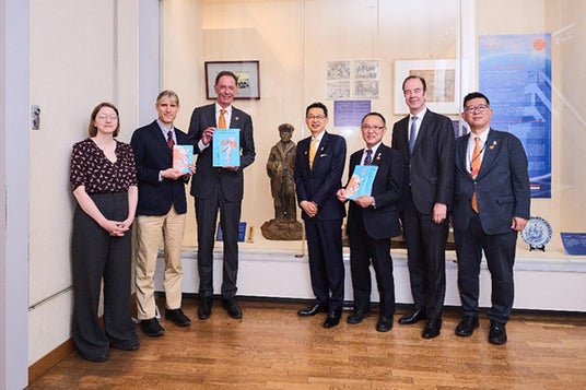 エラスムス立像を囲み記念撮影を行う関係者(左よりオランダ国立公文書館リーヴェ・モイレンベルド学芸員、フレデリック・クレインス国際日本文化研究センター副所長、マーク・カウパース在大阪オランダ王国総領事、高橋徹大阪市副市長、宮本裕次大阪城天守閣館長、ヒルスベスホー・プルッフ駐日オランダ王国特命全権大使、岡本圭司大阪市経済戦略局長)