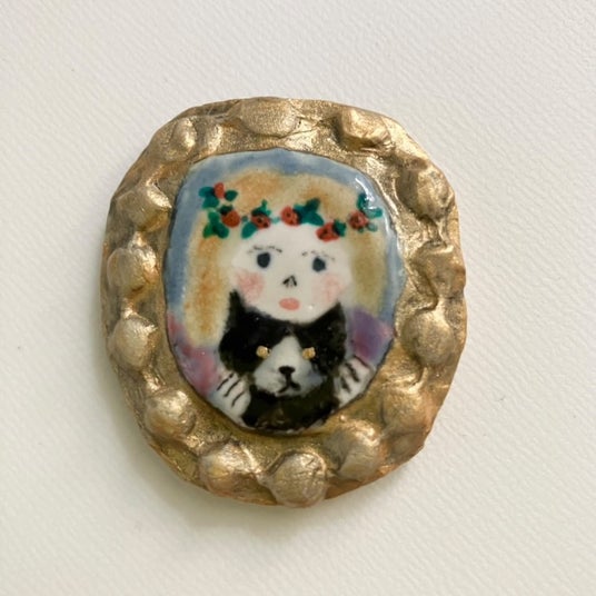 okapi pottery 「陶ブローチ(苺冠)」 4,950円 色釉薬で絵を描き、鮮やかな色や金色は陶芸用の樹脂絵の具を焼き付けています。