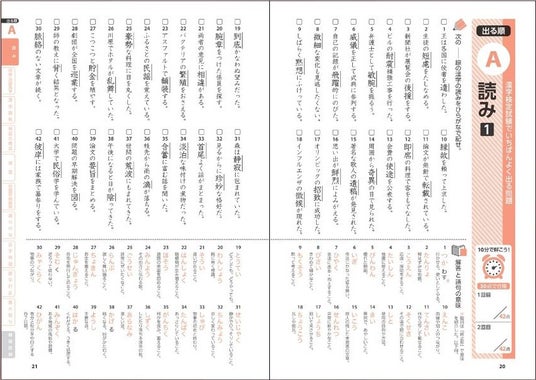 最新の出題傾向を正確に反映した「出る順」で構成されているため、効率よく学習できます。「読み」、「四字熟語」、「書き取り」といった出題ジャンルごとの練習問題を豊富に紹介しています。