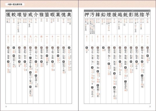 別冊は、4級の出題範囲に準拠した取り外せる配当漢字表。過去20年間に出題された問題を用例とともに掲載しています。赤シートで隠して学習できるので、学習効果が上がります。