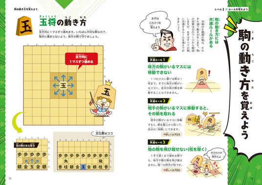 玉将、飛車、角行、金将、銀将、桂馬、香車、歩兵、それぞれの駒の動かし方や成り方、駒の取り方、持ち駒の打ち方などの基本のルールをわかりやすく解説しています。また、反則やゲームの進め方もていねいに解説しています。
