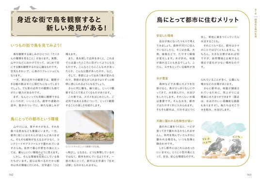 鳥の五感は人とどう違う? 「飛ぶ」ための体の仕組み といった、そもそも鳥ってどんな生き物なのかを解説した章や、鳥きっかけの旅行や、美術や文学の中に出てくる鳥といった様々な楽しみ方を提案した章を設け、観察だけではない鳥のおもしろさを紹介しています。
