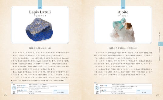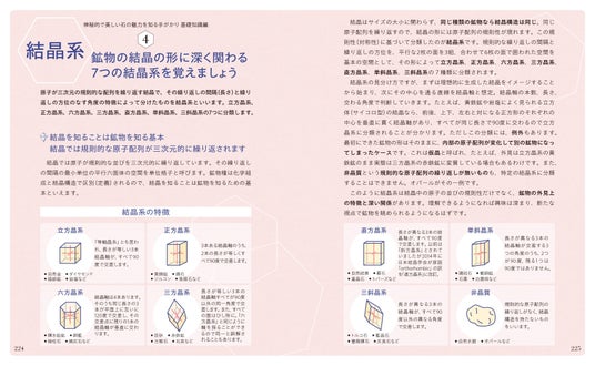 石ごとに、結晶系、比重、硬度、光沢、劈開(へきかい)、条痕などの詳細データも掲載。データにまつわる基礎知識も巻末で解説しています。石に興味を持ち、データを読み解くうちに、さらに石の魅力に惹きこまれていくでしょう。